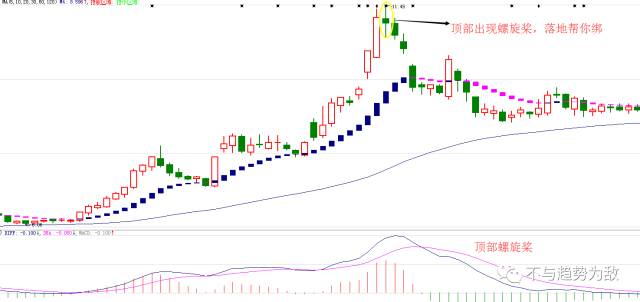 5、顶部螺旋桨在高价区出现,已经失去上升动力,可以想象高空中螺旋桨的后果,坚决卖出。 (顶部螺旋桨图)
