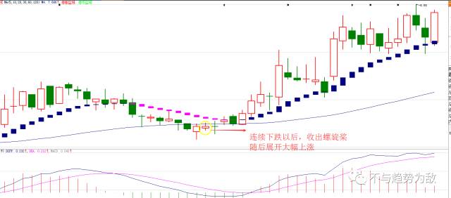 ②、在下跌行情中,如果是有一段较大跌幅之后出现,螺旋桨所起的作用是领涨;