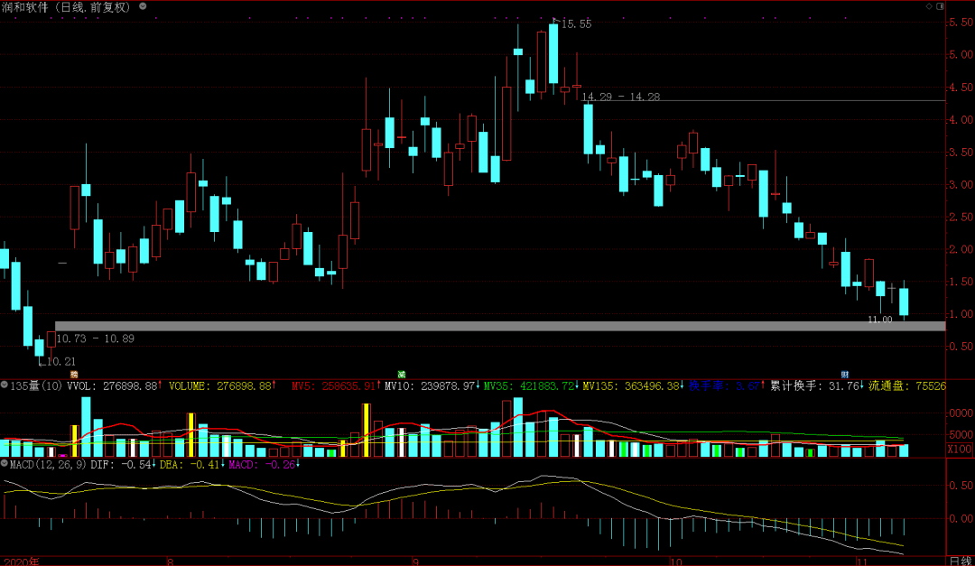 润和软件(300339)也是失效情形的典型。11月4日11.00元低点下引后,11月6日再跌并刷新低点为10.89元,K线图看,11月3、5日缩量收阳,7月21日一字板跳空留下大缺口,MACD绿柱并空头发散。