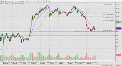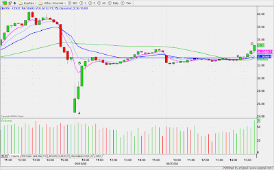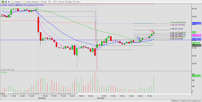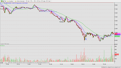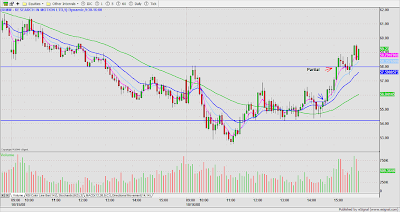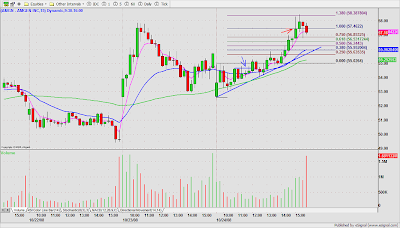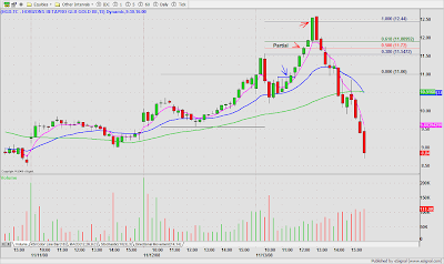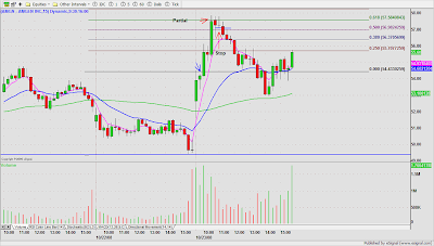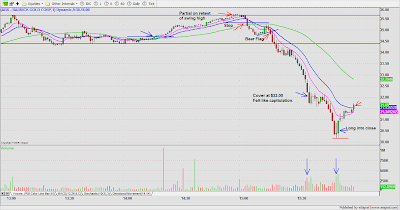 DRYS was a low risk short on price/volume contraction at the base $50.70. Partial after 3WRBs and 38% Fib. extension of the previous day high to the ORL. A whip lash reversal resulted in a stop out with slippage on the balance of the trade. My Esignal platform was unstable most of the day, so I was caught in a dead screen, otherwise, I might have been able to anticipate and get a better exit on the second half.