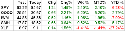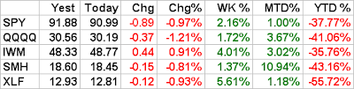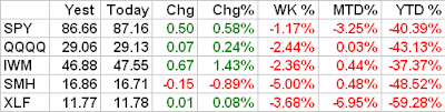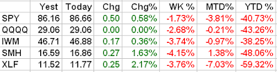 On January 17, 2001 (the day before George Bush's inauguration) the S&P 500 closed at 1329.47, this past Friday (the day before Barack Obama's inauguration) the S&P closed at 850.12. During Bush's 8 year Presidency, the S&P lost 479.35 points or 36.05% If the legacy of a President is judged by the performance of the markets, the Bush administration was a complete failure. More important than how the market performed is how did YOU perform during that time. There is a lot of hope that a new administration will bring new policies which can help turn the market, but the only thing that can cure a bear market is TIME. Focus on price action and until the longer term (weekly) timeframes turn higher all rallies remain GUILTY UNTIL PROVEN INNOCENT!