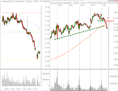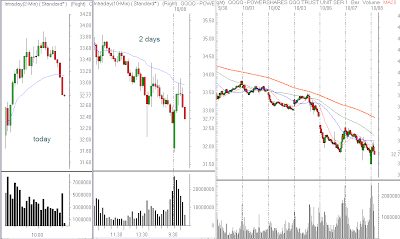 Art Cashin was just mentioning a possible capitulation scenario on CNBC. He thought some hard selling today and tomorrow morning would bring the Dow back below 10,000 and then setup a "massive reversal". I think his scenario makes sense for a TRADABLE bounce. The chart below shows the .618 retracement of the 2002 lows to the 2007 highs, which is found near 9,800. If you are looking to trade a bounce do not buy until there is evidence of a turn developing on the short term timeframes.