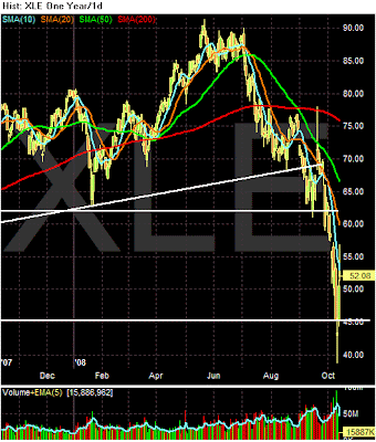 Despite the large move today (SPYs down 5.61%), we're still within my range which is roughly 90-108. However, the overall tenor of the chart is still negative -- all the SMAs are moving lower, the shorter SMAs are below the longer SMAs and prices are still below all the SMAs.