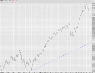 Phew. OK. Back to the markets. As I said earlier, I'm more bearish than normal. Which is saying something. Part of the reason is that, viewing the $SPX minute graph, I sense a sea-change has taken place in the trend. I've drawn it below. |