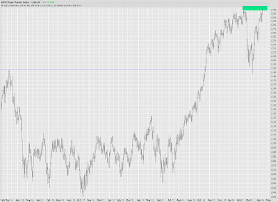 Looking at a short-term S&P chart, we can see that we're getting dangerously close to the high set back in February. It isn't the all-time high (set early in 2000), but it's getting close to that as well. The big question now is, does the market (a) sink from here (b) push up to a double top and then sink (c) blow past the February high and make an assault on the all-time high from the bubble.