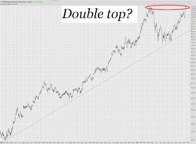 Some indexes pushed to lifetime highs intraday today, but ran out of steam. I do not see any sensational, obvious, the-world-is-coming-to-an-end type pattern. If the market falls, it's going to do so simply because there are no more Greater Fools. As for the S&P 500, shown below, it needs to break below 1,400 before things get interesting.