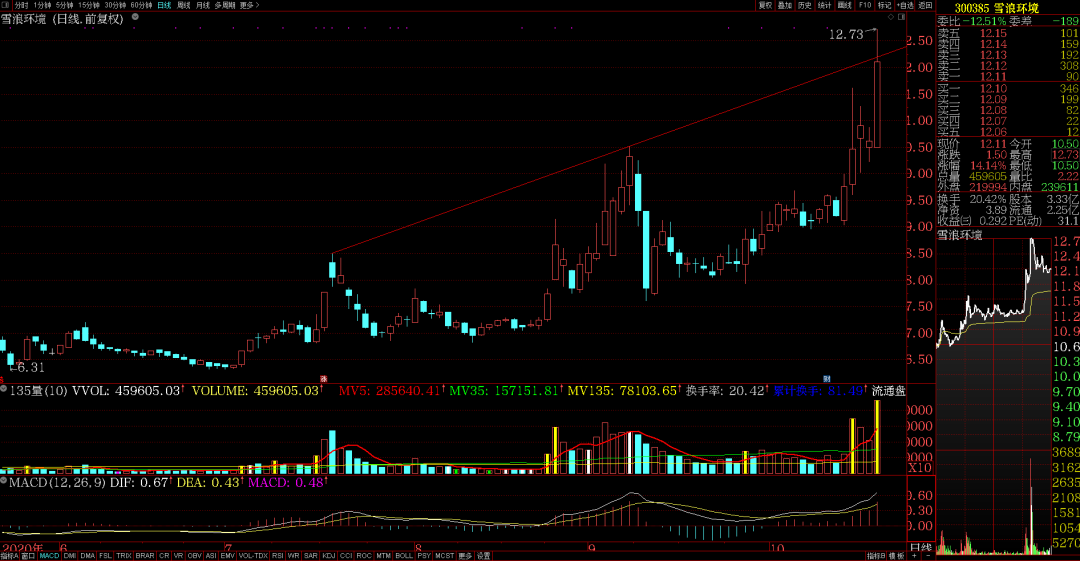 连续上涨后,冲板未果,雪浪环境受到股价趋势线的压制了。