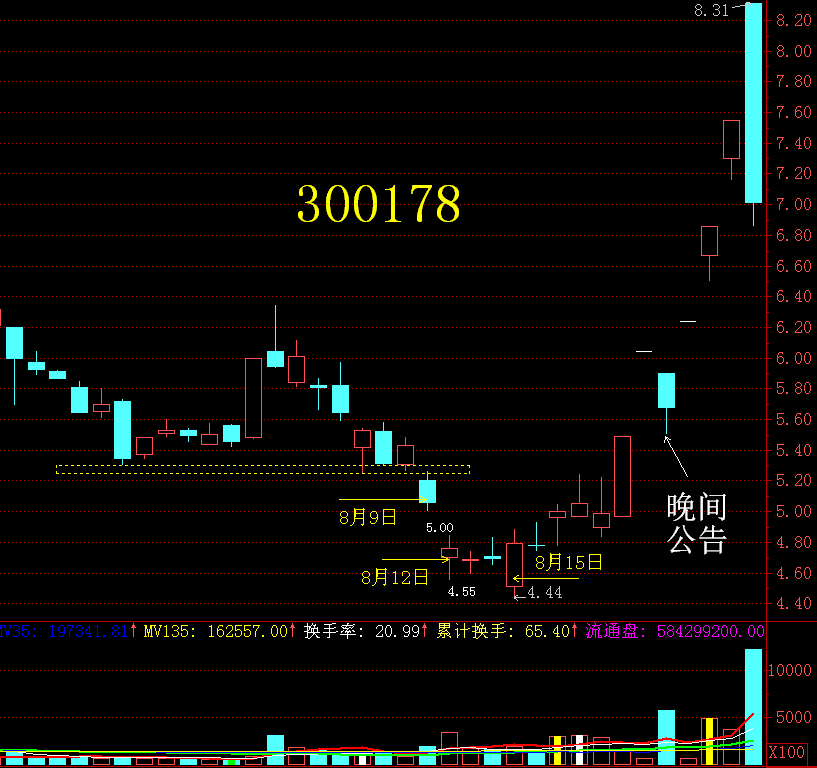 印象最深刻的是腾邦国际(300178),去年和今天分别用对子数见底信号关注、确认、介入。第一段是去年8月份,9日最低点5.00元、12日最低点4.55元都是对子数低点,直至8月15日4.44元出现后,随大盘走势而低开回升,确认见底,此后超过60%的大涨。